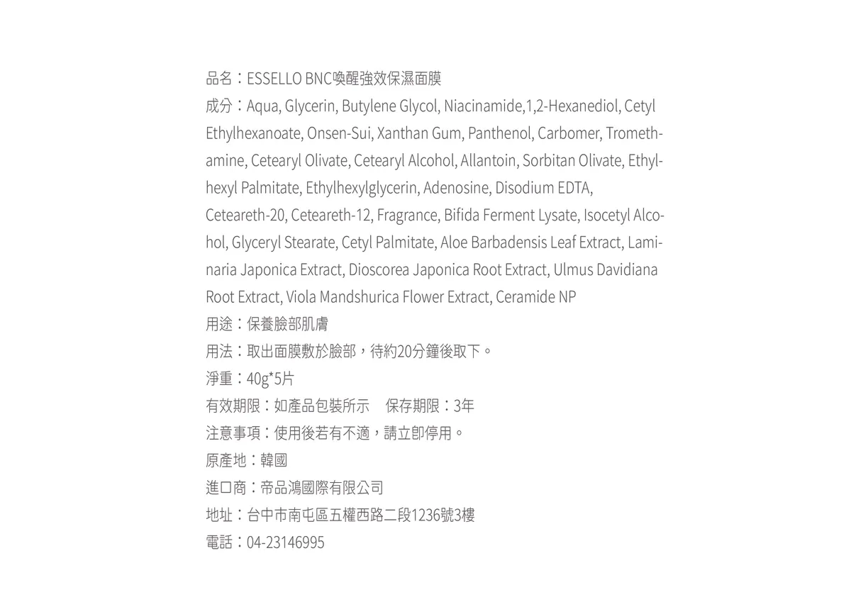 | ESSELLO BNC | 喚醒強效保濕面膜 | 40g/片 | 2片 |